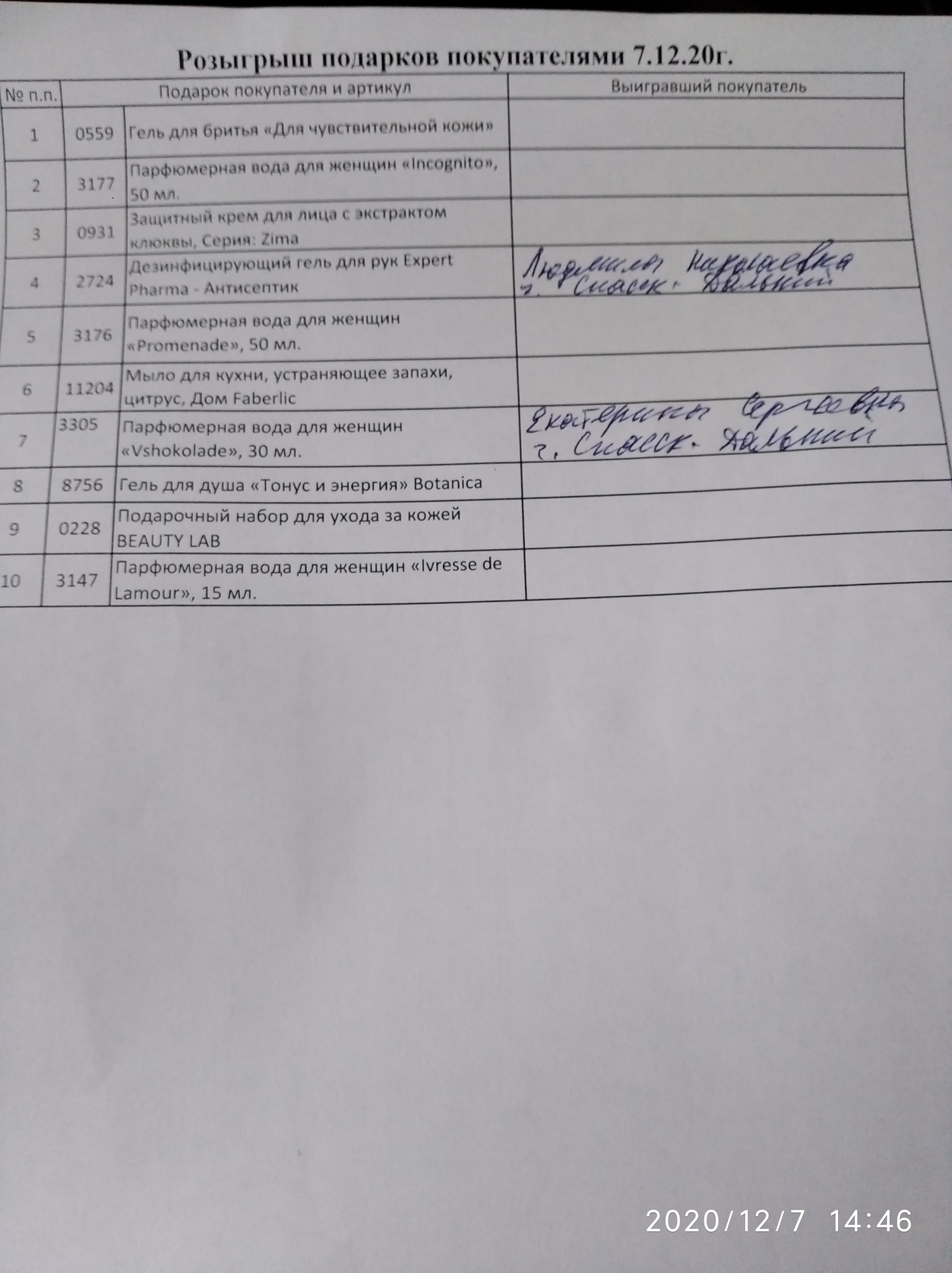 Каждый из покупателей вытягивал билет с номером товаров из списка, а затем список в присутствии покупателей был перевернут лицевой стороной вверх, в результате чего стало ясно какой товар выиграл каждый покупатель.