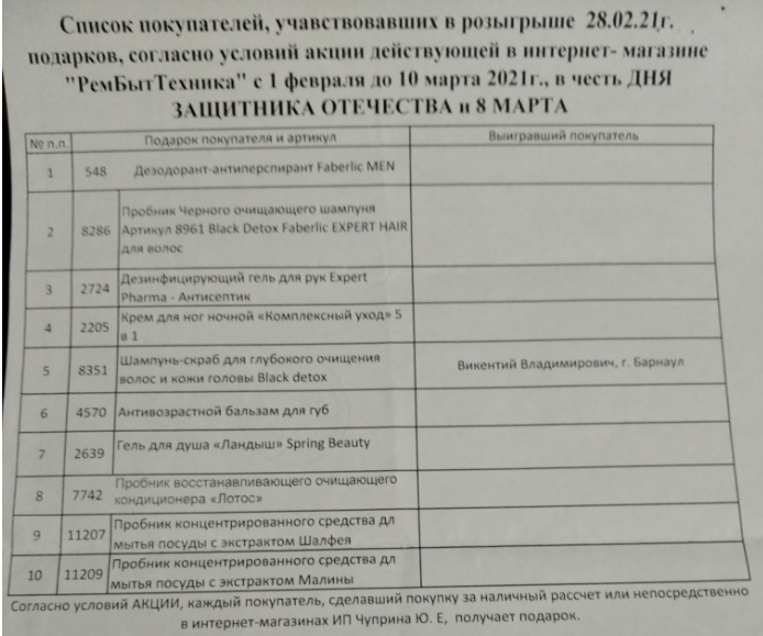 Розыгрыш подарков покупателями 28.02.2021г.