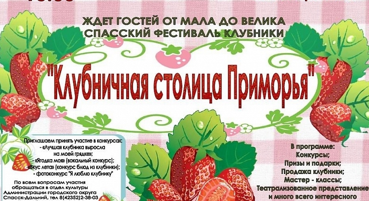 Во время прохождения фестиваля г. Спасск-Дальний-КЛУБНИЧНАЯ СТОЛИЦА ПРИМОРЬЯ все посетители фестиваля могут попробовать СЛАДКУЮ, АРОМАТНУЮ ЯГОДУ КЛУБНИКУ, выращенную на приусадебных участках жителей Спасска-Дальнего и Спасского района Приморского края, приобрести рассаду понравившихся сортов клубники, домашние заготовки из клубники, посмотреть выступления художественной самодеятельности творческих коллективов, участвовать в конкурсах.