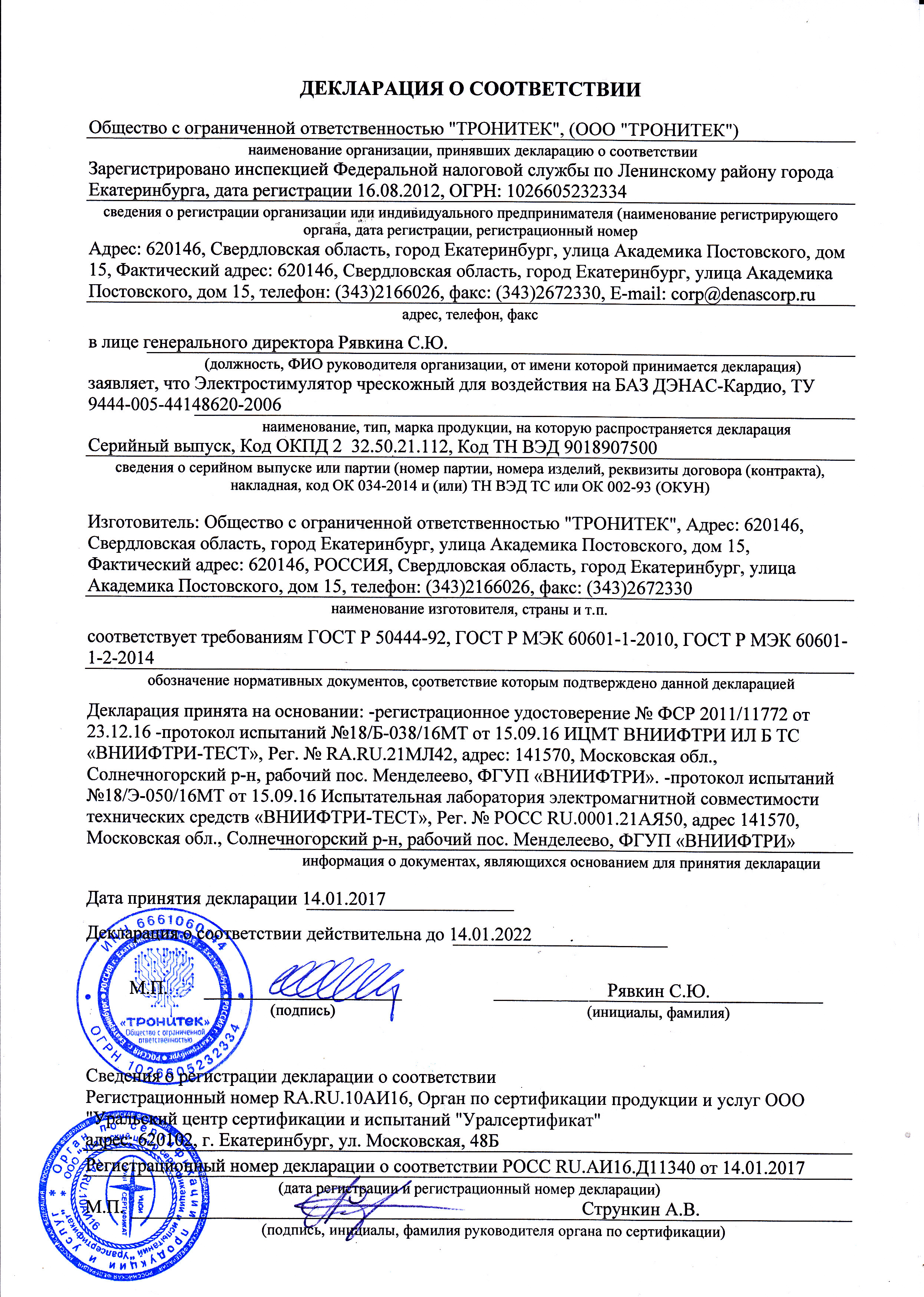 Декларация о соответствии к аппарату ДЭНАС-Кардио