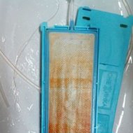 Вода, "проходя" через фильтр, оставляет на нем всю грязь, которая находилась в ней до фильтрации. Если фильтр в процессе работы постоянно находился под водой, его поверхность покрывается налетом равномерно, что мы и наблюдаем на данной фотографии. Данный фильтр работает на кампусе в общежитии ДВФУ (город Владивосток).