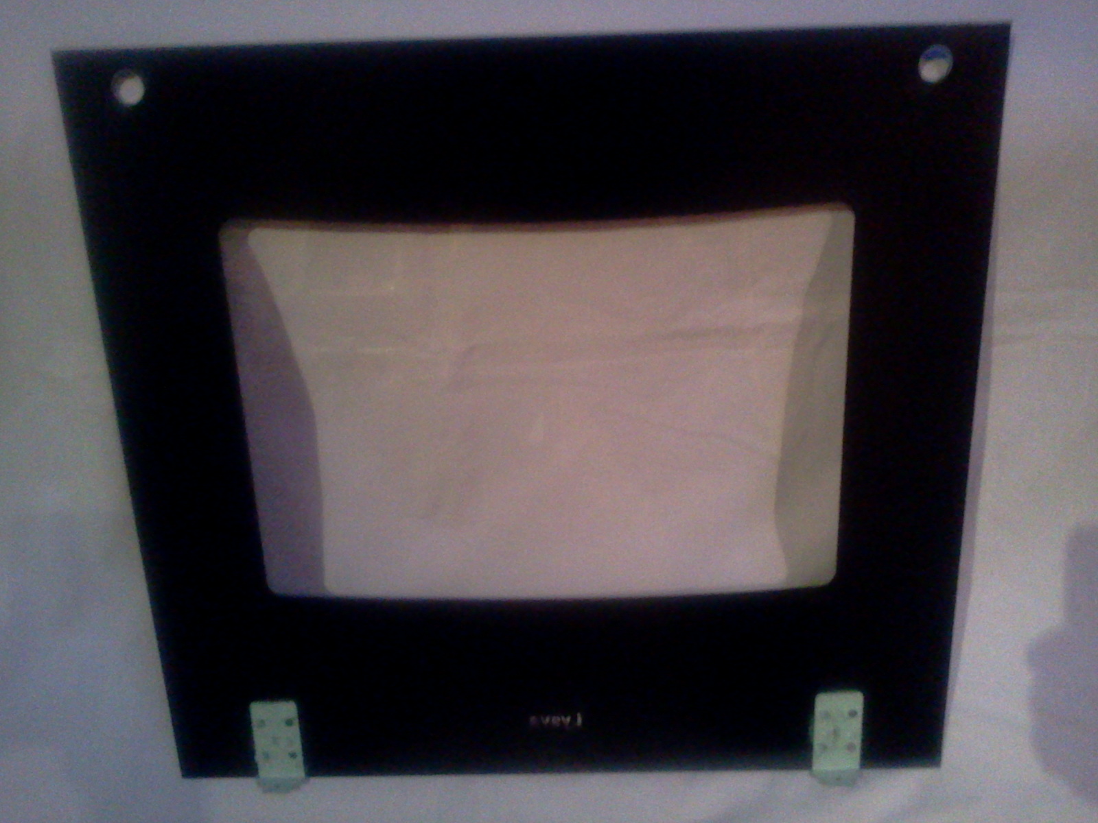 В верхней части стекла имеется 2 отверстия Ф = 18 мм, расположенных в 13 мм от верхнего края и в 30 мм от боковых краев. Отверстия предназначены для крепления ручки дверки жарочного шкафа.