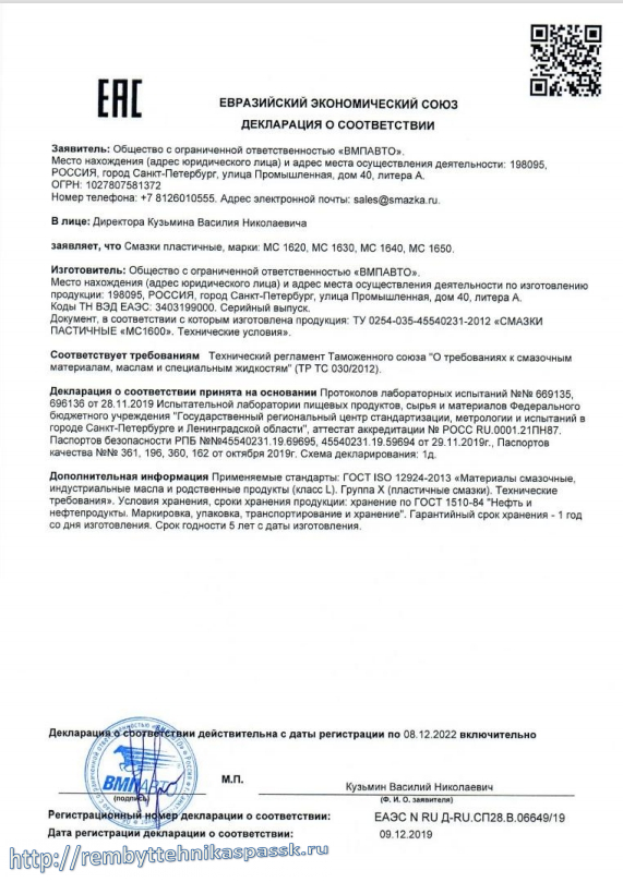 2. Декларация о соответствии на медную высокотемпературную универсальную смазку МС 1640-аэрозоль 400 мл приведена на дополнительном фото.