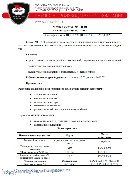 ДОКУМЕНТАЦИЯ на медную высокотемпературную универсальную смазку МС 1640, аэрозоль 400 мл