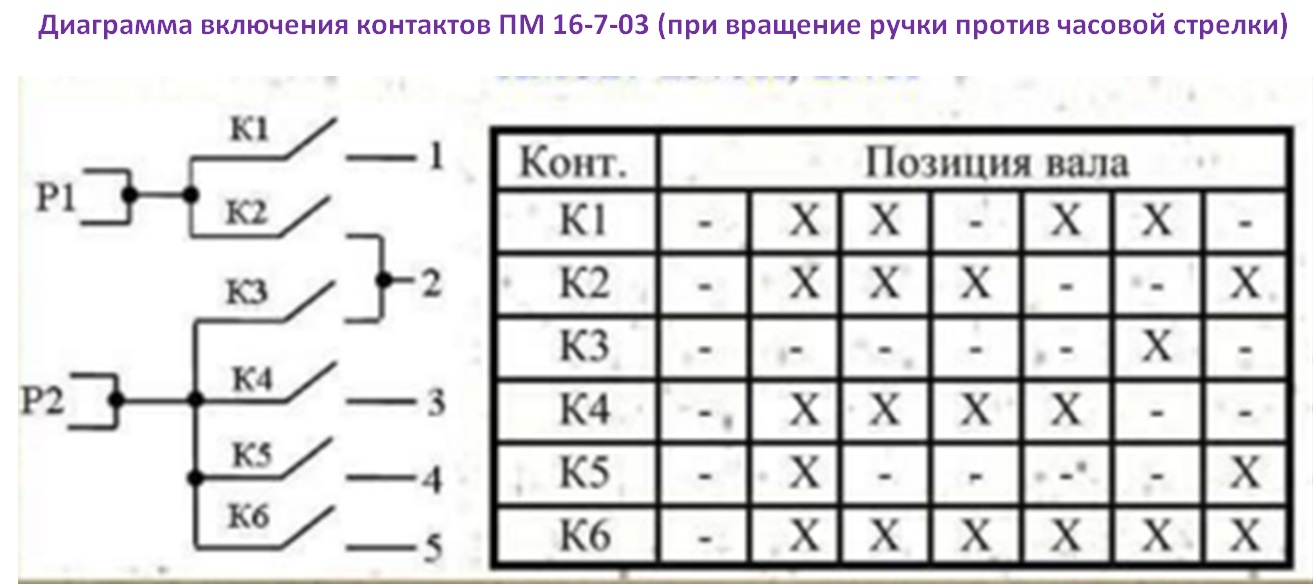 Электрическая схема и диаграмма включения контактов переключателя мощности ПМ 16-7-03 конфорок бытовых плит изображена на дополнительном рисунке товара.