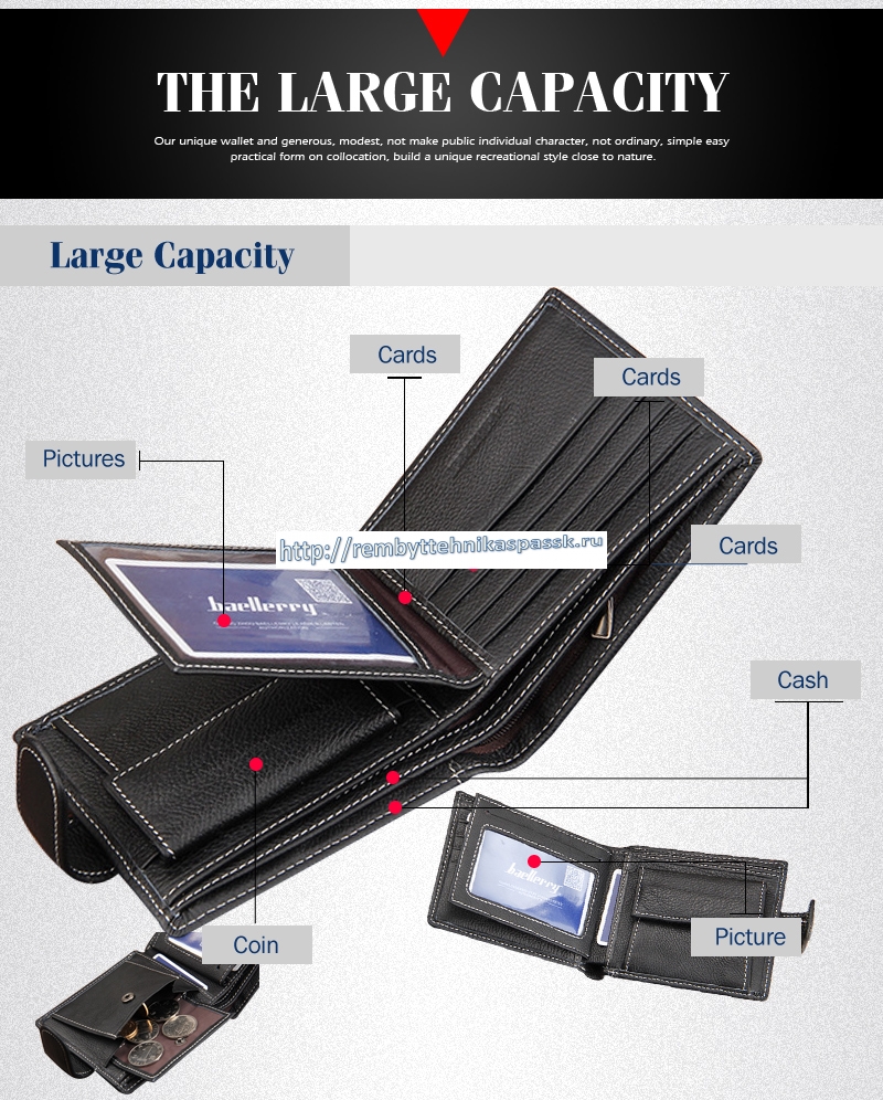 Бумажник изготовлен фирмой с брендом Baellerry, имеет застежку в виде кнопки  и обладает высоким качеством.