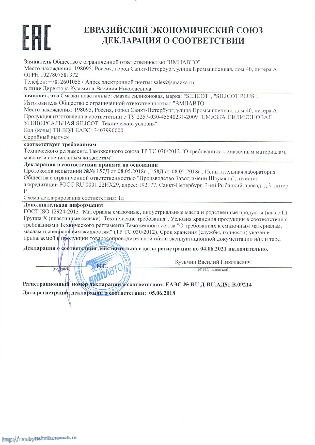 Декларация о соответствии Silicot, Silicot Plus на Высокотемпературную СИЛИКОНОВУЮ СМАЗКУ-ГЕРМЕТИК SILICOT PLUS ВМПАВТО для стерилизаторов и автоклавов изображена на дополнительном фото данной страницы товара интернет-магазина РемБытТехника.