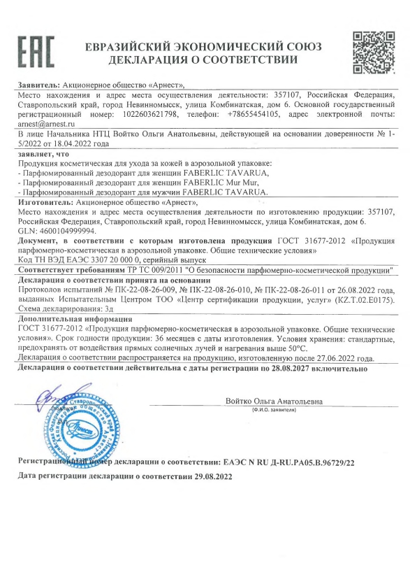 Декларация о соответствии на Faberlic Tavarua парфюмированный дезодорант-спрей мужской смотрите на дополнительном фото к товару.