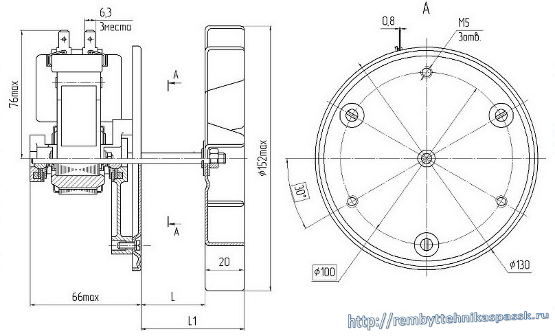 Двигатель-вентиляторы конвекции духового шкафа ДВ-70-2,4-Н имеют размеры: L= 44±2мм, L1=66 мм max, которые можно посмотреть на дополнительном рисунке к данному товару.