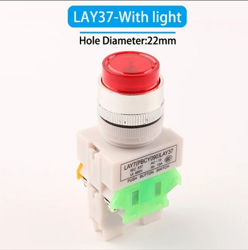 Светящаяся красная кнопка управления без фиксации LAY7 PBCY090 LAY37 1NO1NC с подсветкой на 220 вольт изготовлена из пластика и имеет диаметр шейки крепления под отверстие Ф 22 мм.