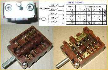Переключатель ПМЭ 27-23623 УХЛ4 используется для переключения мощности нагревательных элементов духовых и жарочных шкафов в плитах типа "Лысьва" и других.