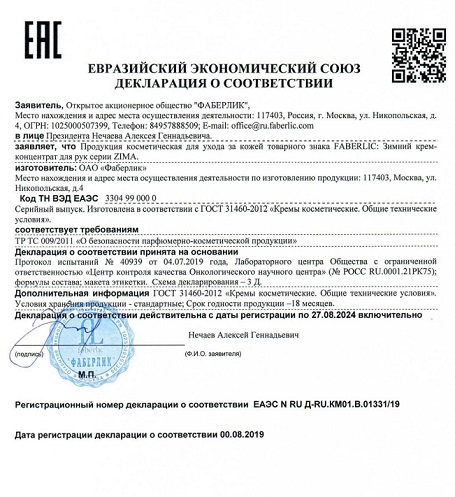 Декларация о соответствии на Защитный крем-концентрат Фаберлик Зима Zima для рук приведена на дополнительном фото к товару.