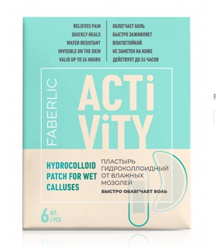 Гидроколлоидный пластырь Фаберлик Activity от влажных мозолей–это экспресс помощь при влажных мозолях от длительной ходьбы, тесной обуви или обуви на высоком каблуке. Гидроколлоидный пластырь Фаберлик Activity от влажных мозолей поддерживает естественный уровень увлажнённости и мгновенно уменьшает боль. Гидроколлоидные пластыри Фаберлик Activity защищают мозоли от трения и внешнего давления, предотвращают попадание влаги и микробов, облегчают боль, способствуют быстрому заживлению кожи, они влагостойкие и незаметны на коже. Гидроколлоидные пластыри Фаберлик Activity действуют до 24 часов.