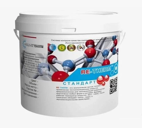 Сверхтонкая керамическая жидкая теплоизоляция RE-THERM Стандарт ведро 10л-это уникальный инновационный теплоизоляционный материал, который при толщине слоя всего в 1 мм RE-THERM = 50 мм традиционных утеплителей по своей эффективности действия! Благодаря этому сверхтонкая керамическая жидкая теплоизоляция RE-THERM Стандарт при применении его с внутренней стороны зданий и резервуаров не сокращает полезный