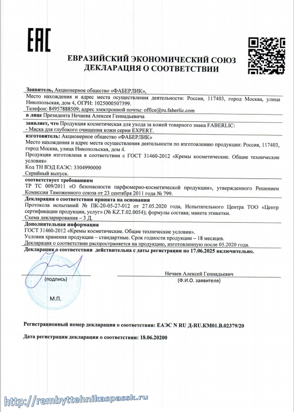 Декларация о соответствии: Маска для глубокого очищения кожи серия EXPERT-декларация о соответствие смотрите на дополнительном фото